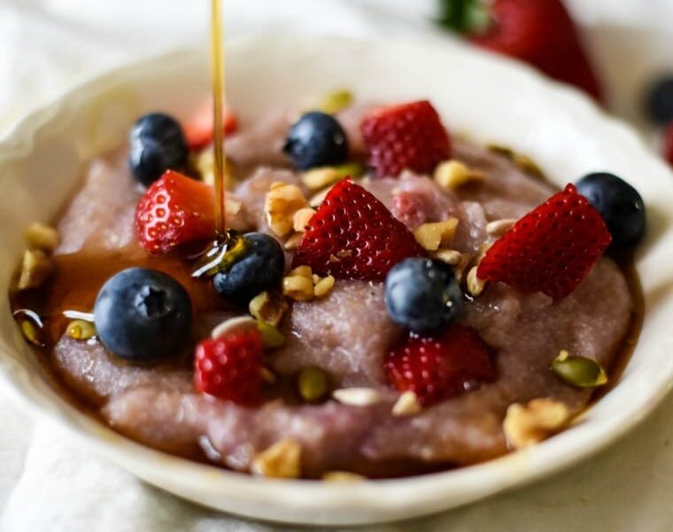 Egy közepes méretű edényben keverjük össze a kukoricadarát pontosan annyi vízzel, hogy paszta képződjön. Adjunk hozzá 1 pohár vizet és alaposan keverjük össze. Adjuk hozzá a bogyós gyümölcsök felét. Főzzük a kását forralásig, utána közepes lángon folyamatos keverés mellett 10 percig, vagy amíg a kívánt állagot el nem éri. Ha szükséges, adjunk hozzá még vizet. A megfőtt kását tegyük egy tálba, szórjuk rá a maradék gyümölcsöt, dióféléket és magokat, majd öntözzük meg juharsziruppal.